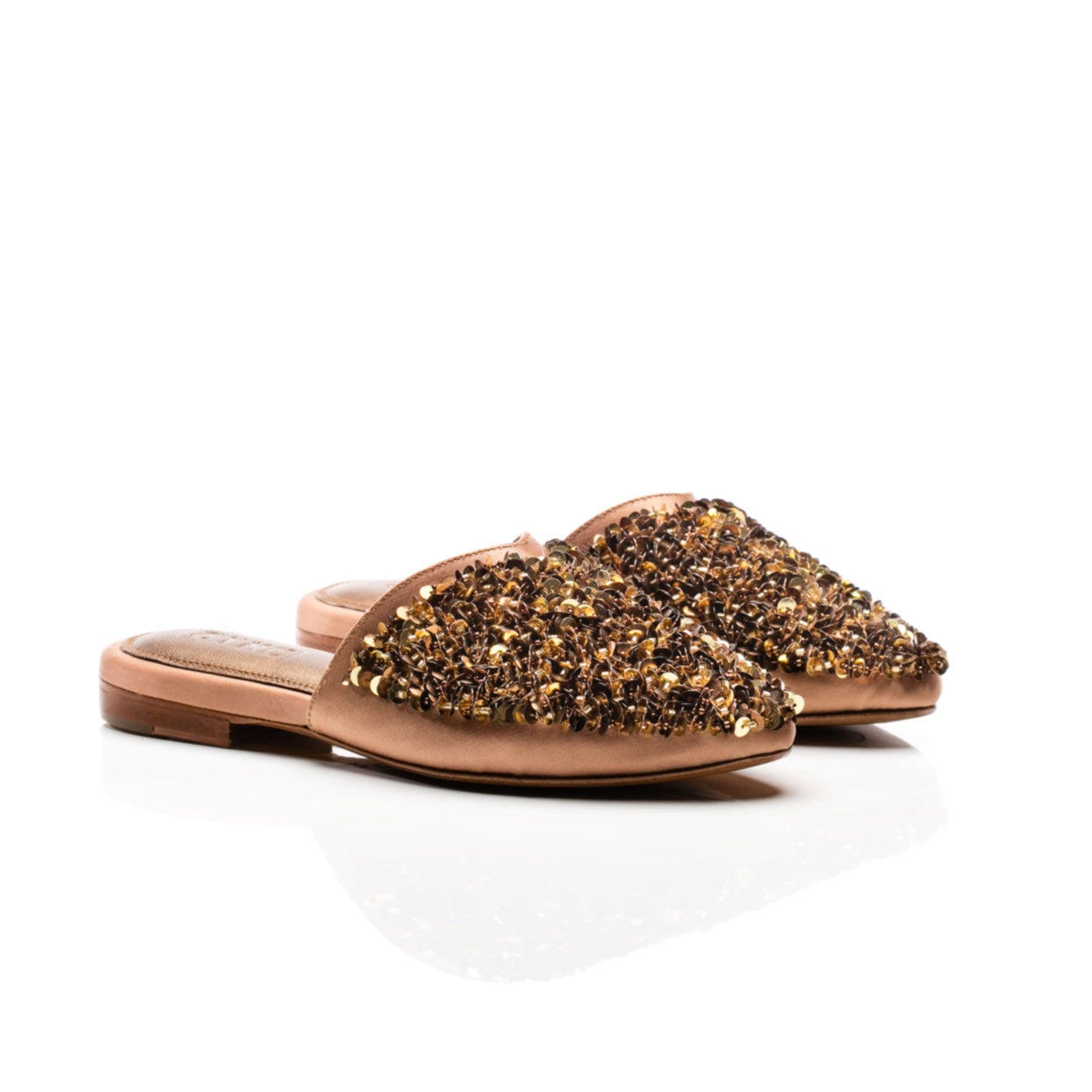 Les mules Moon scintillent à chacun de vos pas. Leur empeigne dorée et ambrée, brodée à la main, capte la lumière et attire tous les regards. De jour comme de nuit, cette pièce ultime apportera une touche de glamour à votre garde-robe.